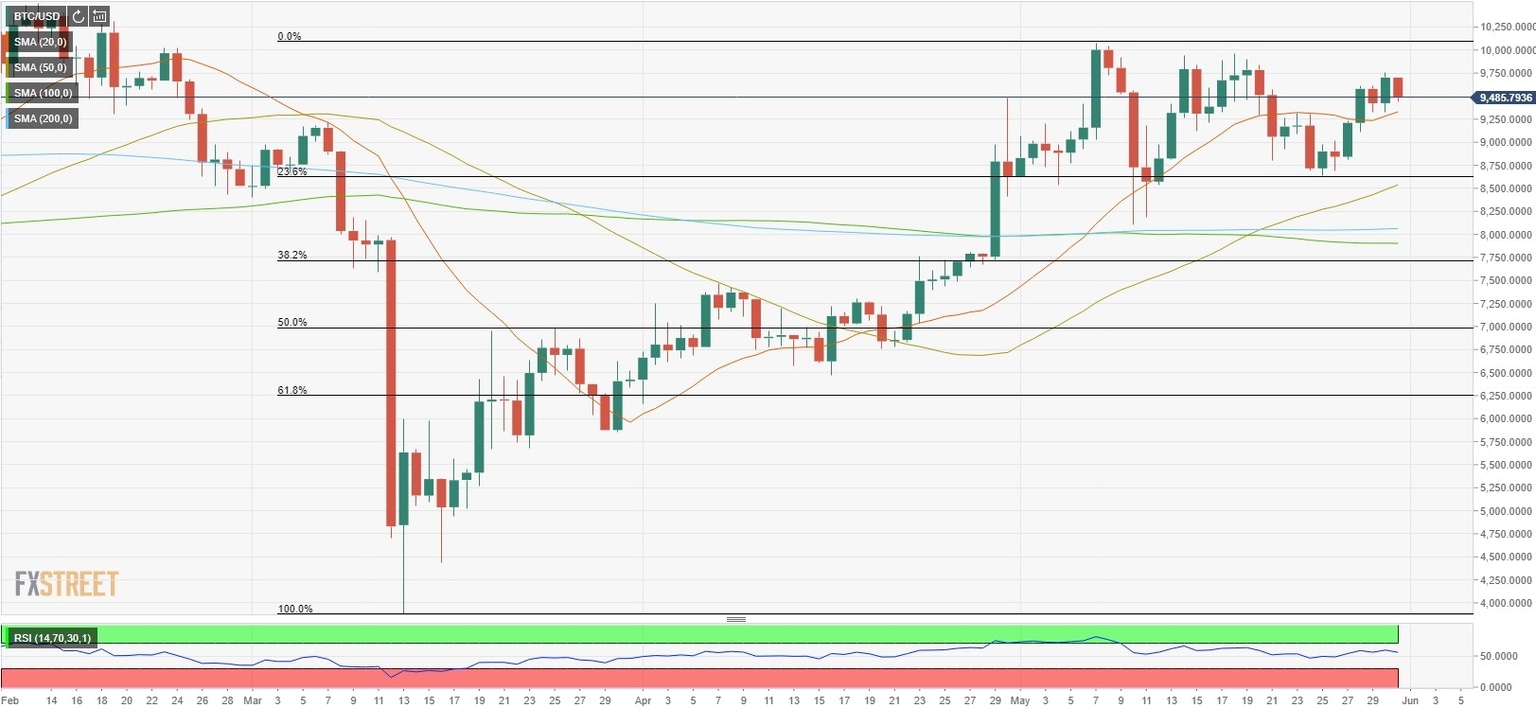 Looking at the daily chart, BTC/USD seems to be consolidating in a relatively wide range between $8,650 (Fibonacci 23.6% retracement of March 13 - May 17 uptrend) and $10,000 (psychological level). The next decisive move is likely to come after the price successfully breaks out of this channel.