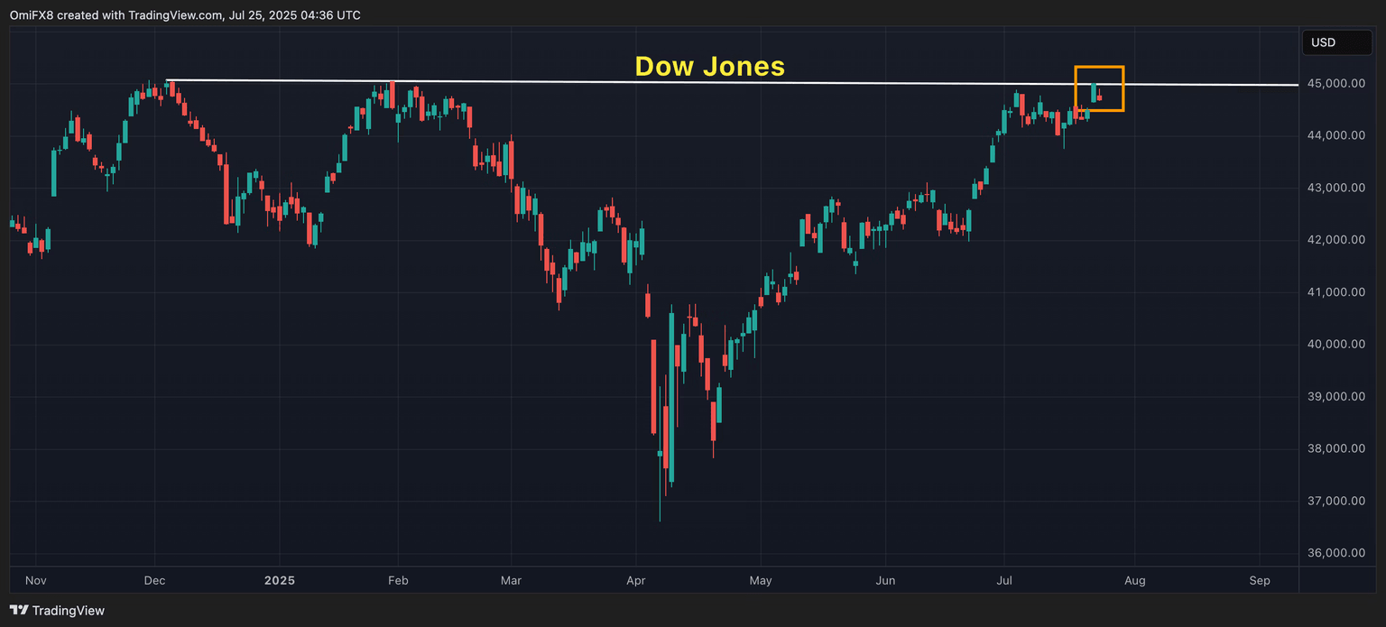 Overnight, Wall Street's Dow Jones index fell 0.70% in a sign that sellers were looking to re-establish their dominance at 45,000, the horizontal resistance identified by highs reached in December and January. A potential bearish reversal from here could sour sentiment in the crypto market.