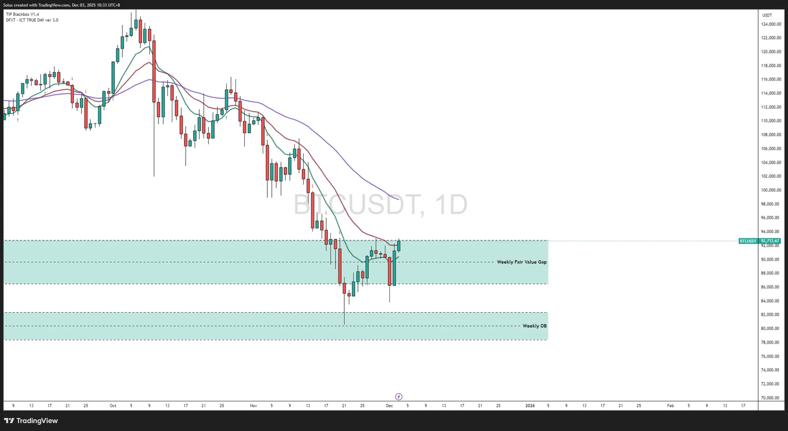 From a higher-timeframe perspective, Bitcoin tapped a Weekly Order Block — the same zone that triggered a large expansion earlier this year. This OB has now behaved like genuine structural support, producing the first meaningful rebound since BTC started its controlled decline.