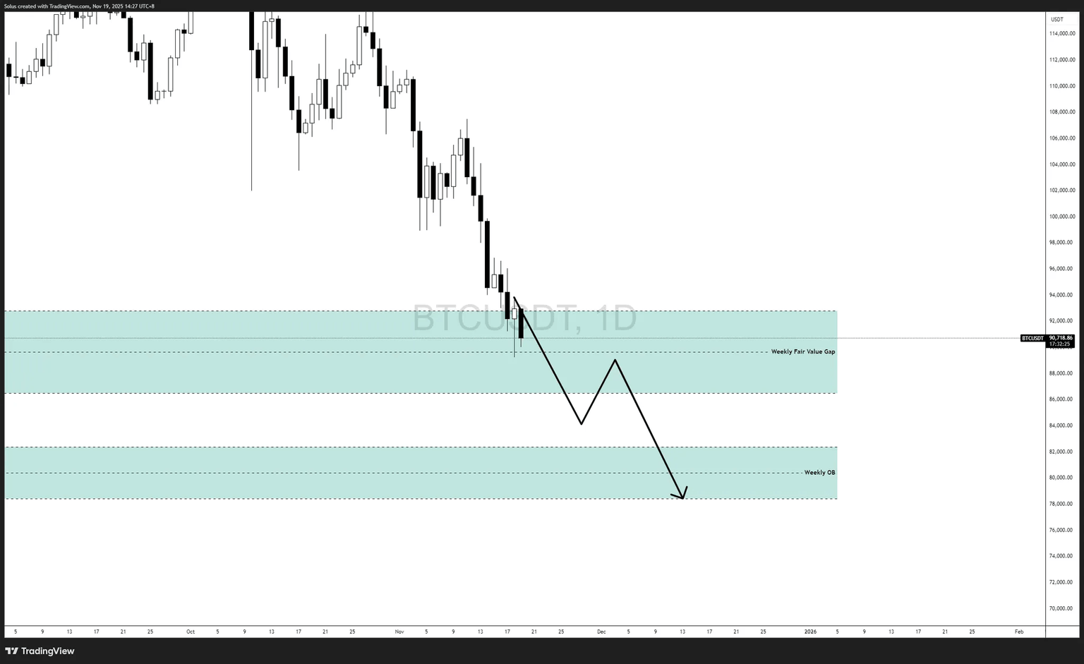BTC eventually flushed into deeper liquidity beneath the $85,000–$80,000 pocket — a zone that was highlighted as a likely destination before any meaningful recovery could begin.