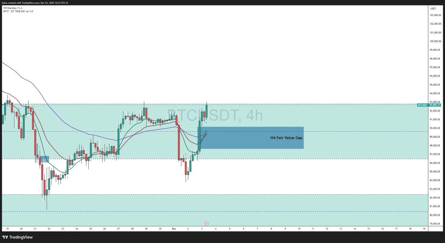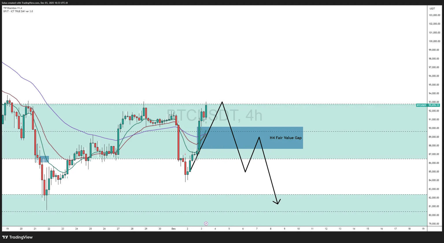 - A retracement into the H4 Fair Value Gap (near $89,000–$90,000)