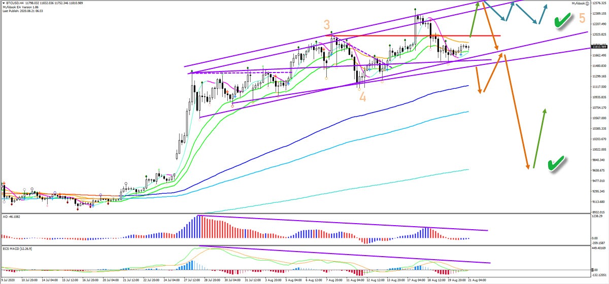 The BTC/USD is facing deep and heavy Fibonacci retracement levels. Currently a bearish bounce seems to be the most likely scenario. A failure to move higher could start a bearish ABC pattern, which confirms a larger ABCDE (orange) triangle pattern. In that case, the inverted head and shoulders pattern (blue boxes) are expected to act as support and would end the triangle formation and should restart a strong uptrend.