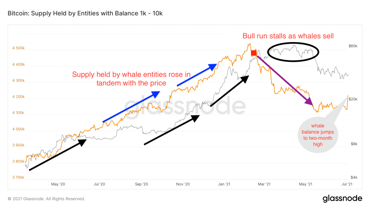 - Whales became sellers in the subsequent months, taking the wind out of the bull run, and by early May, their bitcoin stash had dropped by 8% to 4.17 million BTC.