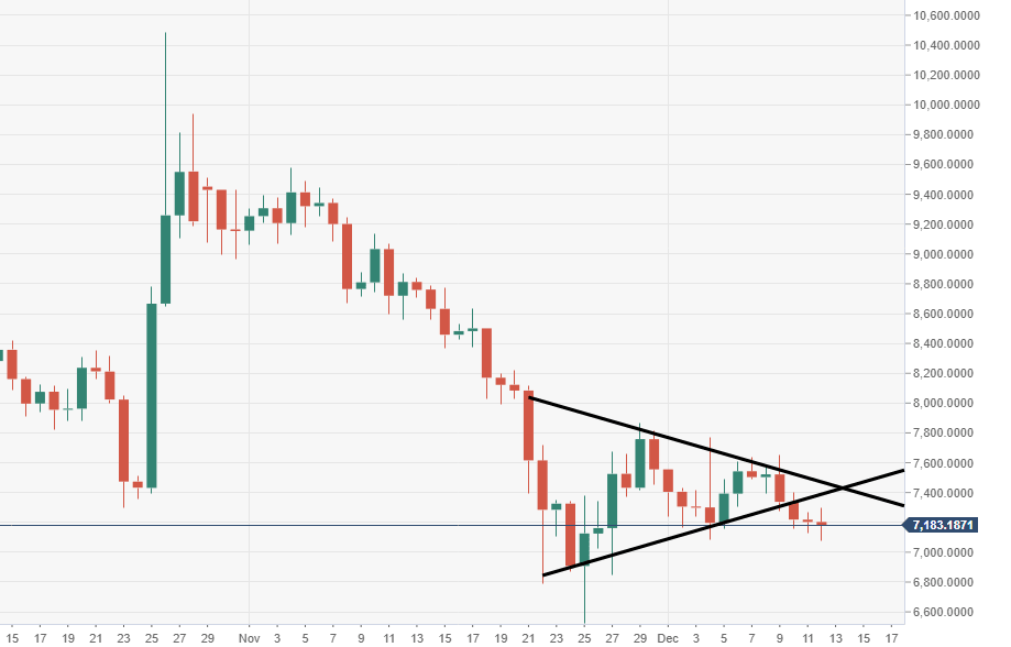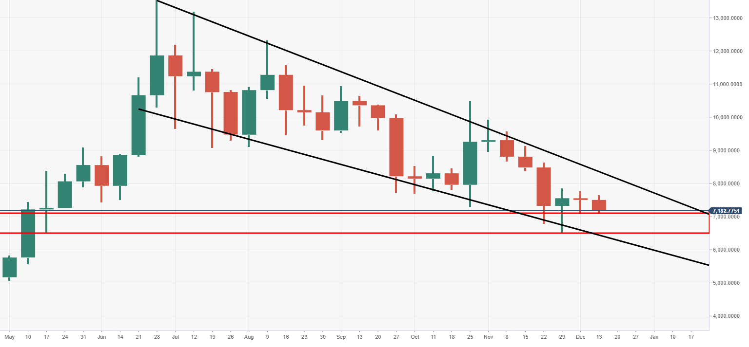 The price is running towards a second consecutive week in the red, as the bears lock in on weekly support zone at $7000-6800 range.