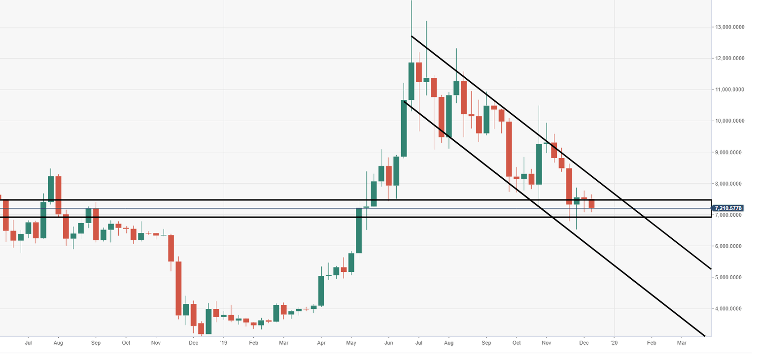 The price is still running towards another weekly close in the red, as the $7000-6800 critical zone remains at risk of a breach.