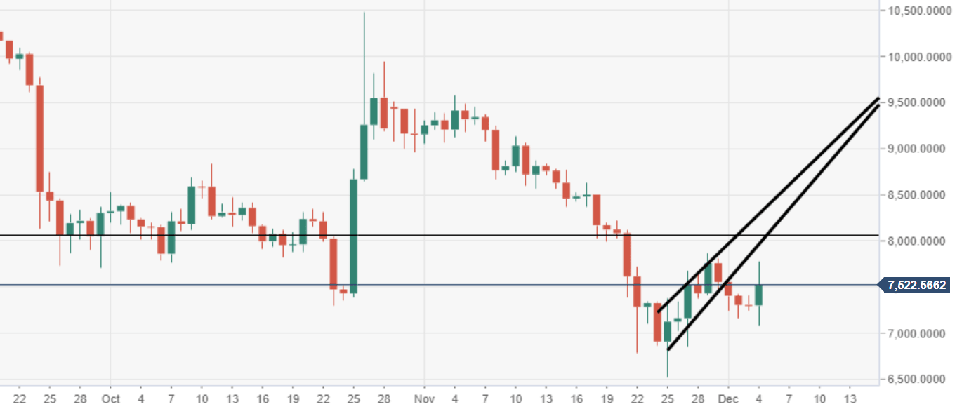 - There is a chunky barrier of resistance seen at $7500, in proximity to the lower of the noted flag.