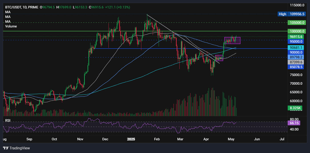 Buyers, supported by the RSI above 50, signaling bullish momentum, will look to break above 97.7k to extend gains towards 100k.