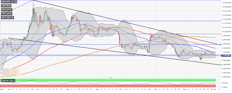 Bitcoin has resumed the decline on Thursday, January 2, and touched the intraday low of $7,087. The downside momentum has been gaining traction after the price slipped below $7,150 (61.8% Fibo retracement). The psychological support of $7,000 will slow down the sell-off; however, once it is broken, the downside momentum will pick up speed with the next focus on $6,800 ( the lower line of the daily Bollinger Band). It is followed by a December low of $6,532 and a psychological $6,000.