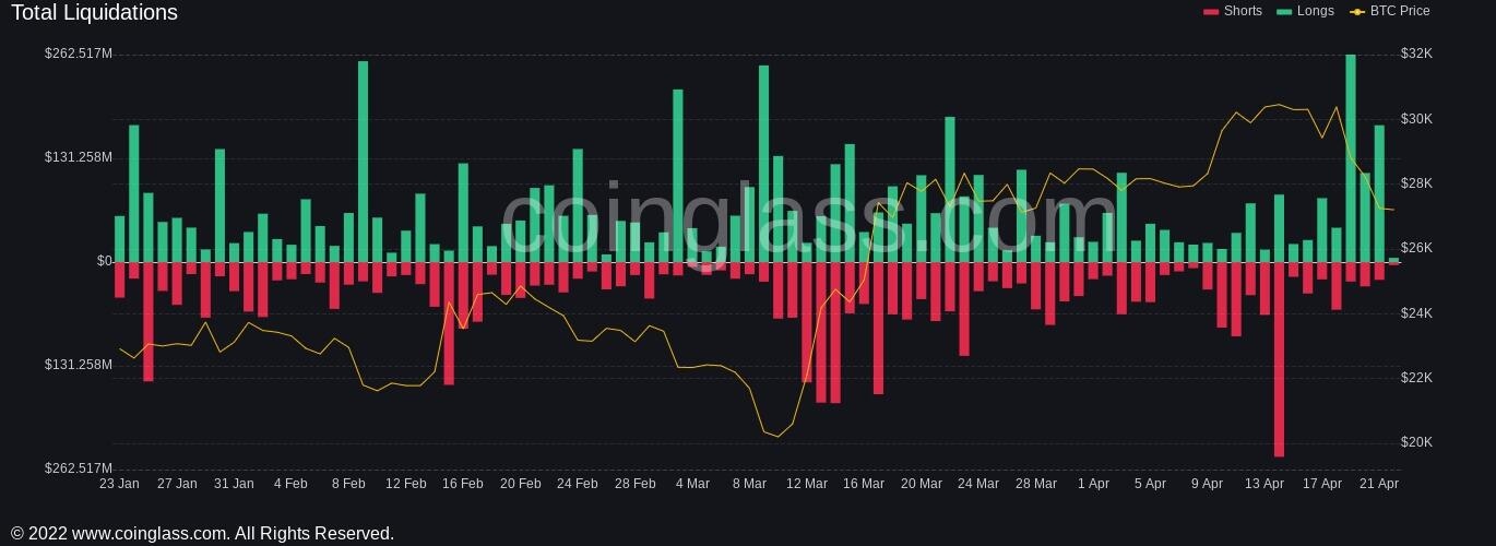 The market composition remained apt to liquidate traders, with Coinglass data showing April 22 costing crypto longs another $173 million.