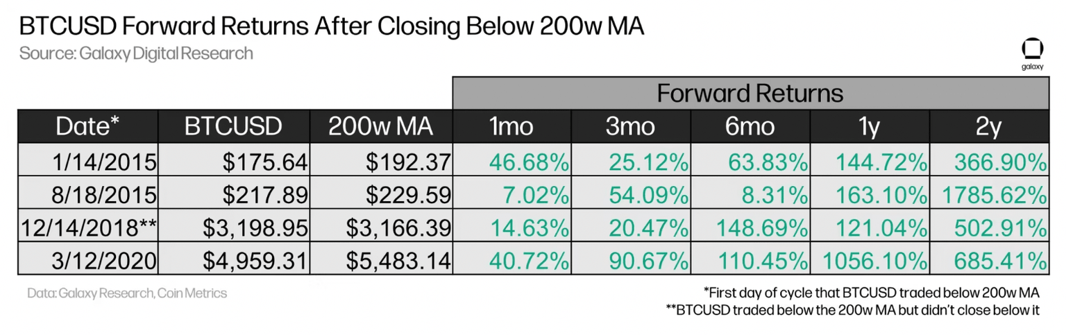 In bitcoin's history, traders who bought BTC below the 200-week moving average returned a profit every time within multiple time frames. (Galaxy Research, Coin Metrics)