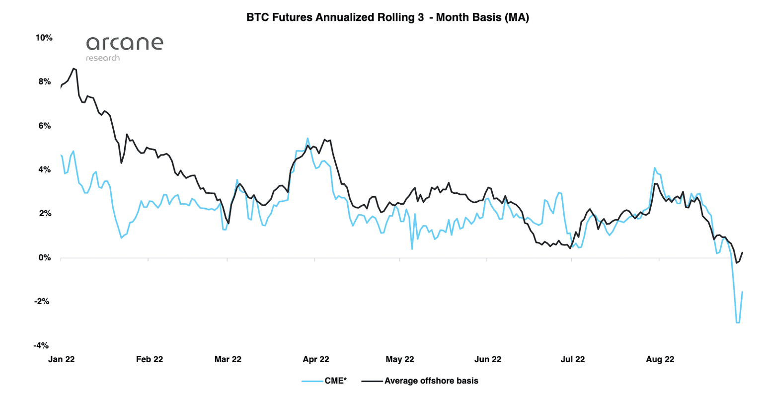 BTC offshore futures rolling basis dropped to multi-year lows at the end of August. (Arcane, Skew)
