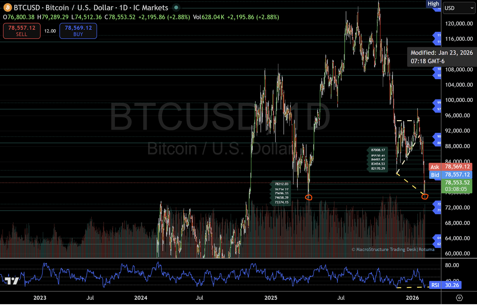 - Failure to reclaim and hold that level keeps the focus on the lower structure, where the 78,000 to 73,000 zone remains active.