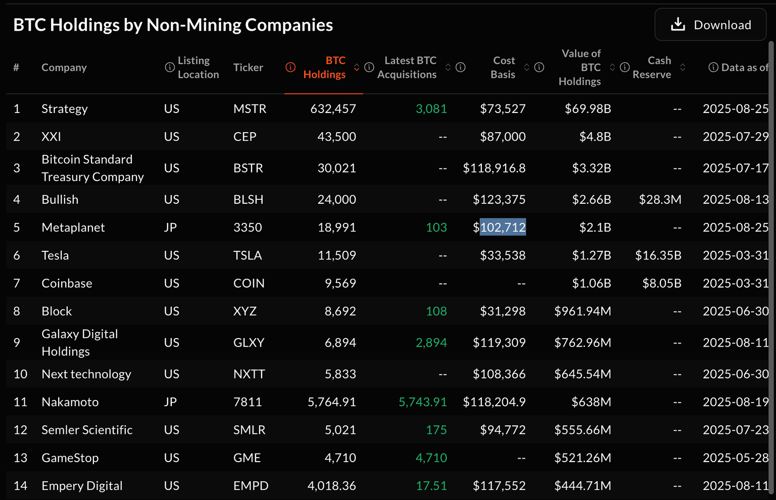 As of August 25, Metaplanet holds 18,991 BTC, valued at around $2.1 billion. It is the fifth-largest corporate holder of Bitcoin, behind Bullish (BLSH), which holds approximately 24,000 BTC worth around $2.6 billion.