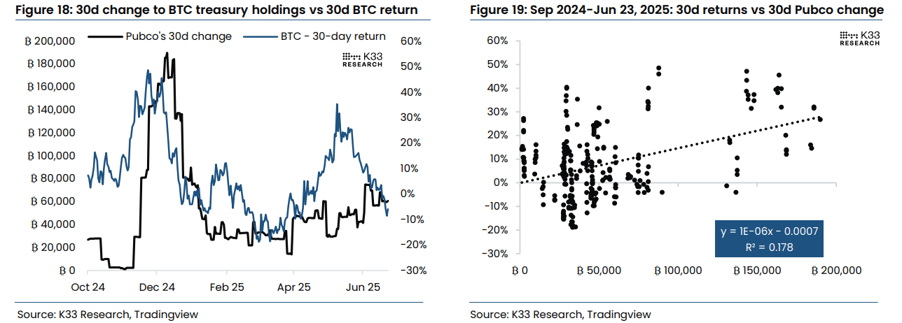 Despite the increasing treasury allocations to Bitcoin among companies in recent months, its price hasn't seen much gain. The correlation between the 30-day flows for public companies buying Bitcoin and 30-day returns has been weak, noted K33 Research analysts led by Vetle Lunde in a report on Tuesday.