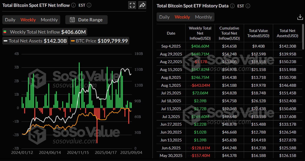 Bitcoin price recovery has been supported by institutional and corporate investors so far this week. SoSoValue data below shows that Bitcoin spot Exchange Traded Funds (ETFs) recorded a total of $406.60 million in inflows so far this week as of Thursday, continuing its second consecutive week of positive flows. However, these weekly inflows are smaller compared to those seen during mid-July, when BTC rallied toward $120,000 mark for the first time.