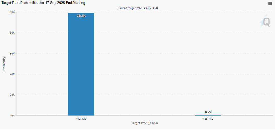 The CME Group’s FedWatch tool, as shown in the graph below, indicates a 99.3% possibility of a 25 basis points (bps) rate cut by the central bank at September's meeting. Fed rate cut expectations may weigh on the US Dollar (USD) and boost risk-on sentiment, supporting a recovery in riskier assets, such as BTC. Furthermore, market participants expect the central bank to deliver at least two rate cuts by the end of 2025, which could further boost riskier asset prices such as BTC.