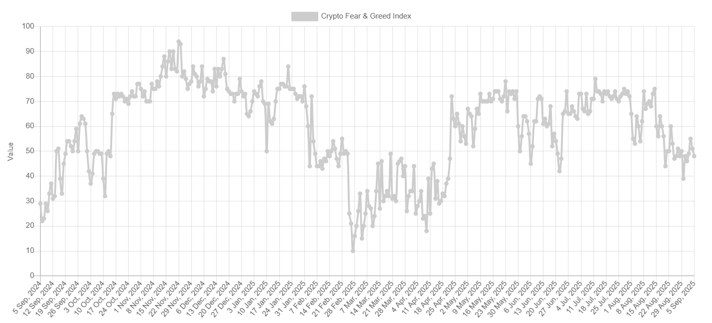 The Crypto Fear and Greed Index metric, which measures the overall sentiment of the cryptocurrency market, has recovered to 48 this week, reflecting a neutral sentiment and suggesting that bearish pressure may be easing.