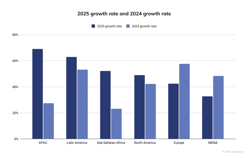 The Asia-Pacific (APAC) region led with 69% year-over-year growth in on-chain crypto transactions, driven primarily by India, Vietnam and Pakistan, while Latin America followed with 63% growth.