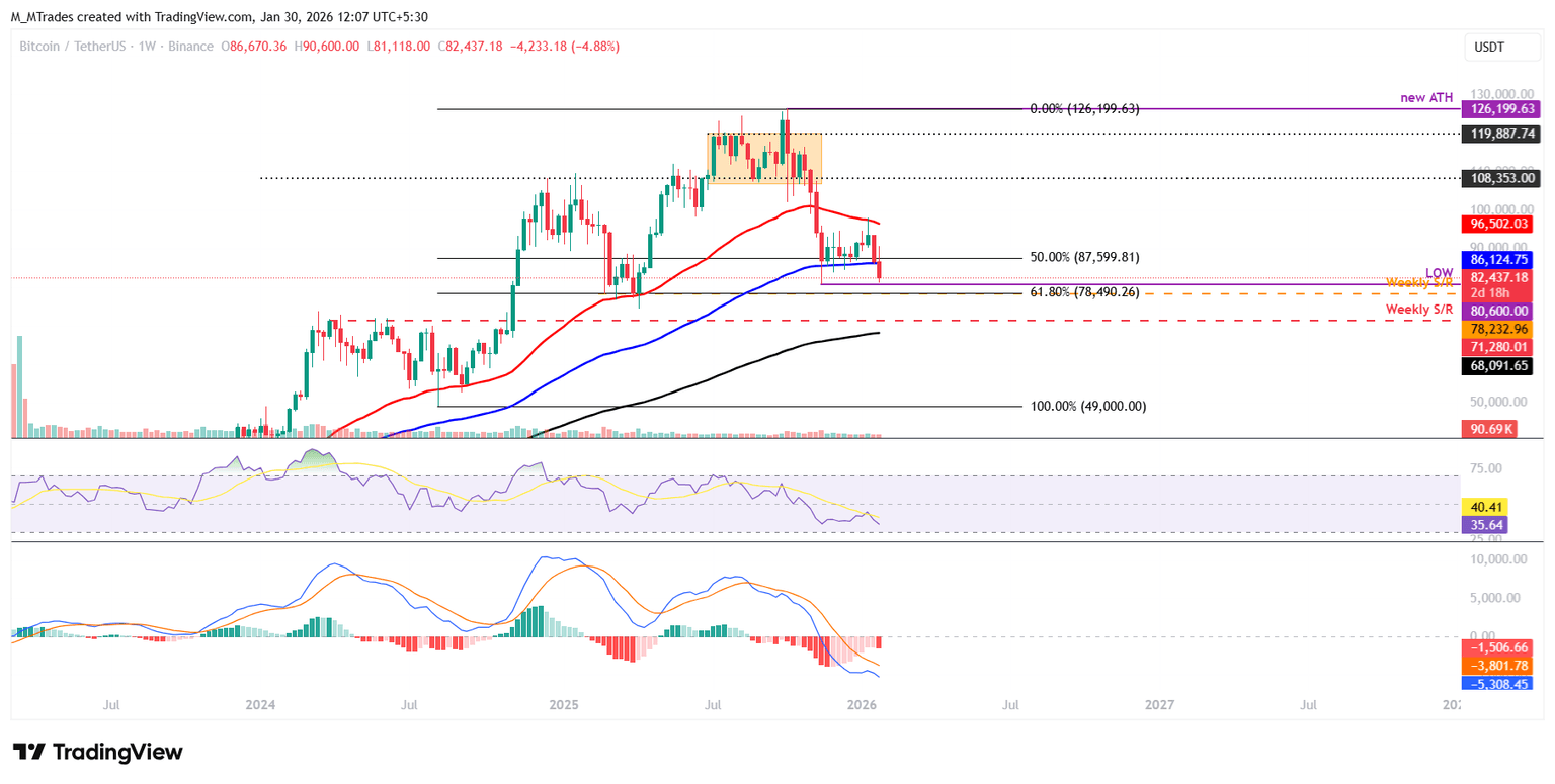 If BTC closes below the 100-week EMA at $86,124 on a weekly basis, it could extend the decline toward the November low of $80,600. A close below the latter could extend further losses toward the 61.8% Fibonacci retracement level (drawn from the August 2024 low of $49,000 to the October 2025 all-time high of $126,199) at $78,490.