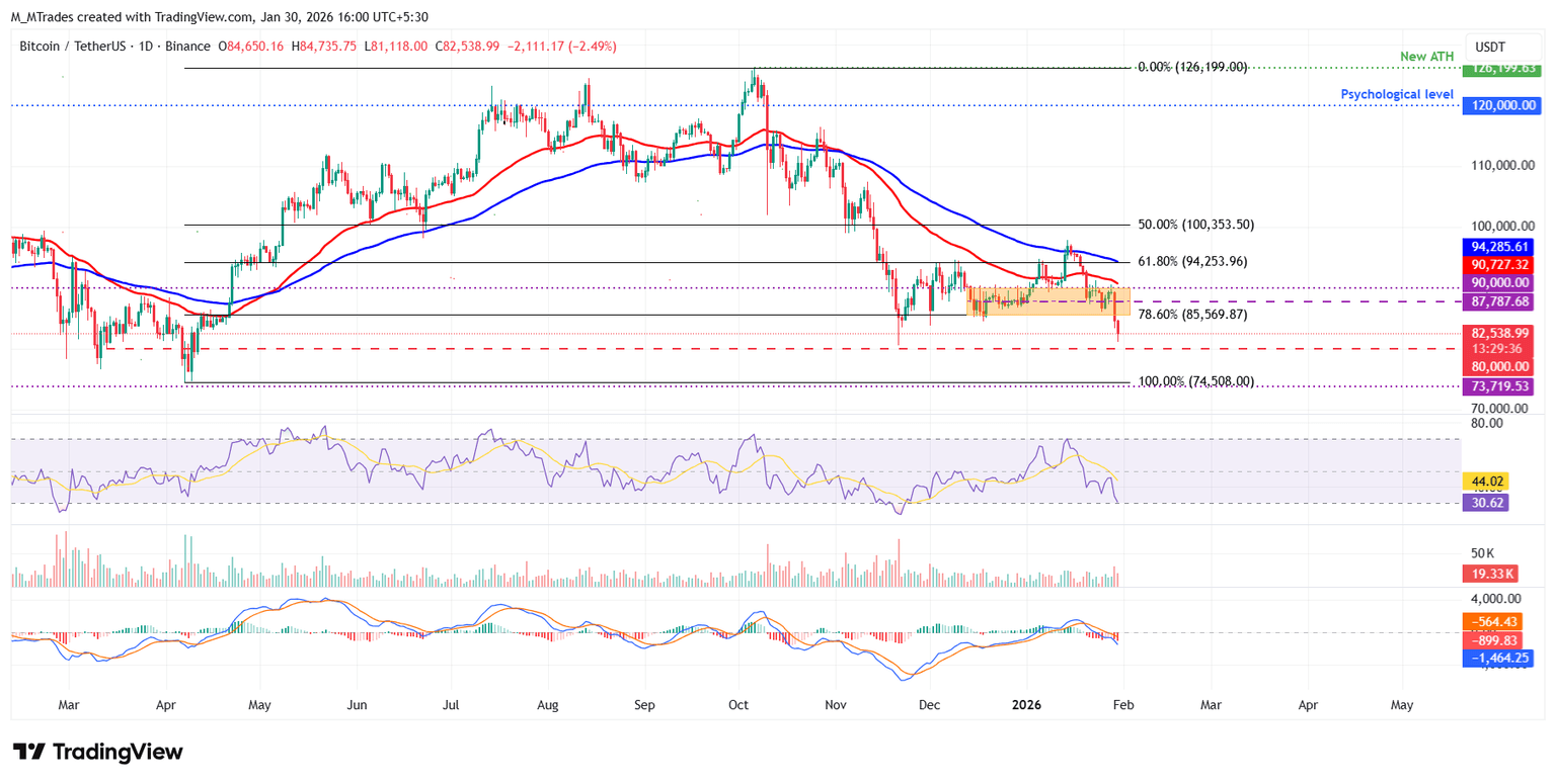 If BTC continues its downward trend, it could extend the decline toward the November low of $80,600. A decisive close below this level could extend the fall toward the April 7 low (2025 yearly lows) at $74,508.
