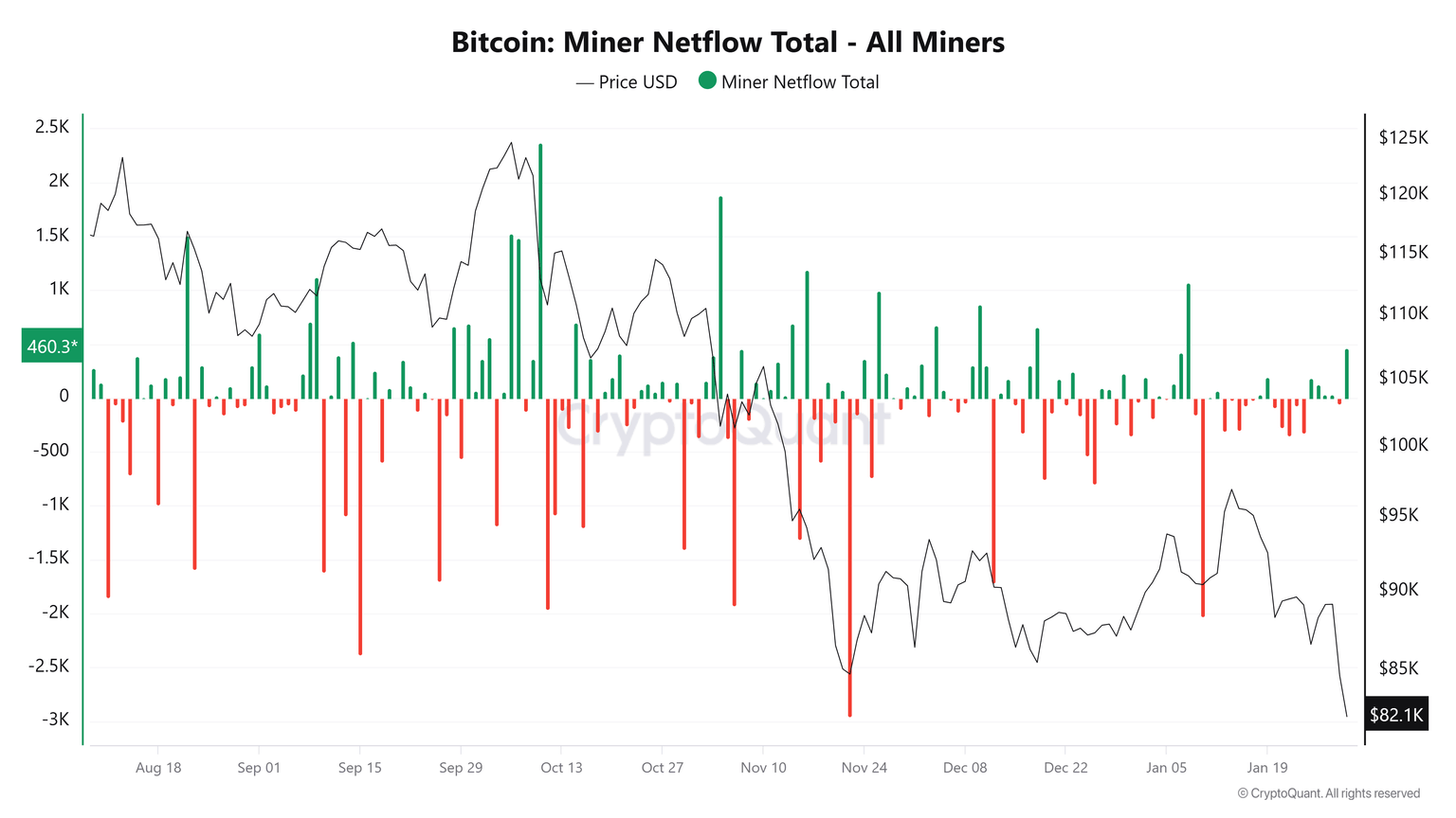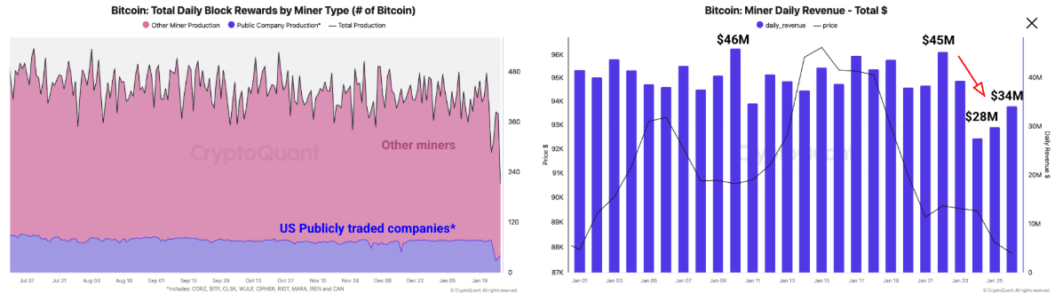 Daily mining revenues dropped from $45 million on January 22 to a yearly low of $28 million two days later. Daily revenues have not fully recovered, standing at $34 million on January 26.