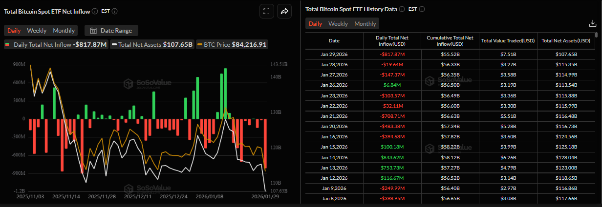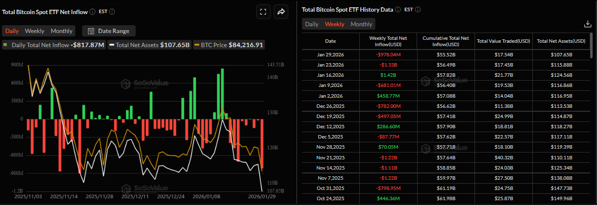 Bitcoin price correction this week was further supported by fading institutional demand. The SoSoValue chart below shows that spot Bitcoin Exchange-Traded Funds (ETFs) recorded a total outflow of $978.04 million through Thursday, marking their second consecutive weekly outflow. Moreover, Thursday’s outflow highlighted the highest single-day outflow of $817.87 million since November 21. If these outflows continue and intensify, BTC could see further correction.
