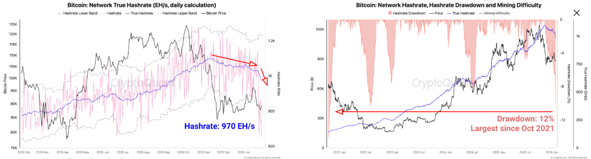 “The Hashrate has declined 12% since November 11, 2025, compared to a 14% drawdown in October 2021, when Bitcoin’s hashrate was recovering from the China mining ban,” reports CryptoQuant's analyst.