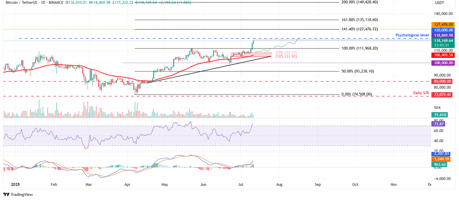 Bitcoin (BTC) price prints a new all-time high near $118,900 on Friday, entering uncharted territory as bullish momentum accelerates. The surge in BTC was supported by rising corporate and institutional demand, with spot Bitcoin Exchange Traded Funds (ETFs) recording a total of $1.69 billion this week as of Thursday.