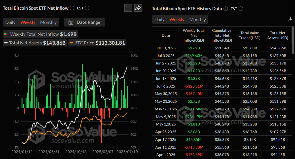 - Corporate and institutional demand remains robust, with spot Bitcoin ETFs recording a total of $1.69 billion this week as of Thursday.