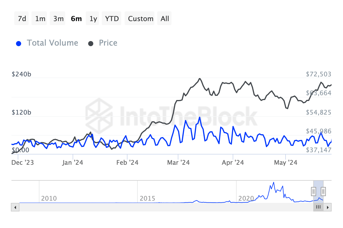 According to IntoTheBlock’s Large Transactions Volume index, institutional activity has slowed down recently. Between May 21 and 31, this metric dropped from $67 billion to $38 billion, indicating that whales are not interested in BTC at the current levels and are not accumulating.
