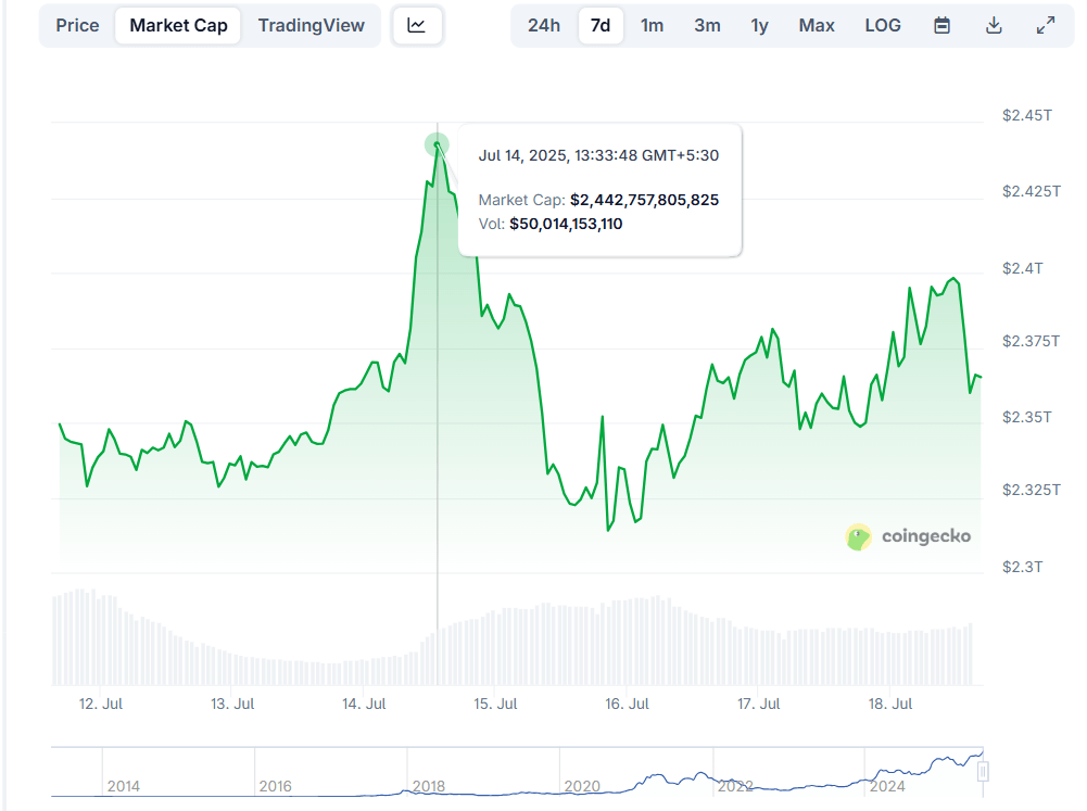 Bitcoin started the week on a positive note, reaching a new all-time high of $123,218 on Monday. CoinGeko data shows that the BTC market capitalization surpassed $2.4 trillion that day and currently hovers around $2.36 trillion.