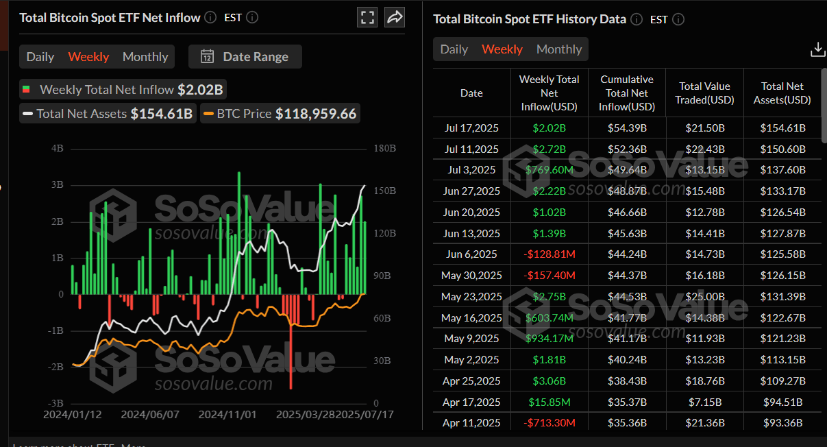 Bitcoin price has been supported by rising corporate and institutional demand this week. According to SoSoValue data, Bitcoin Spot ETFs have recorded a total inflow of $2.02 billion as of Thursday, marking the sixth consecutive week of positive flows since mid-June.