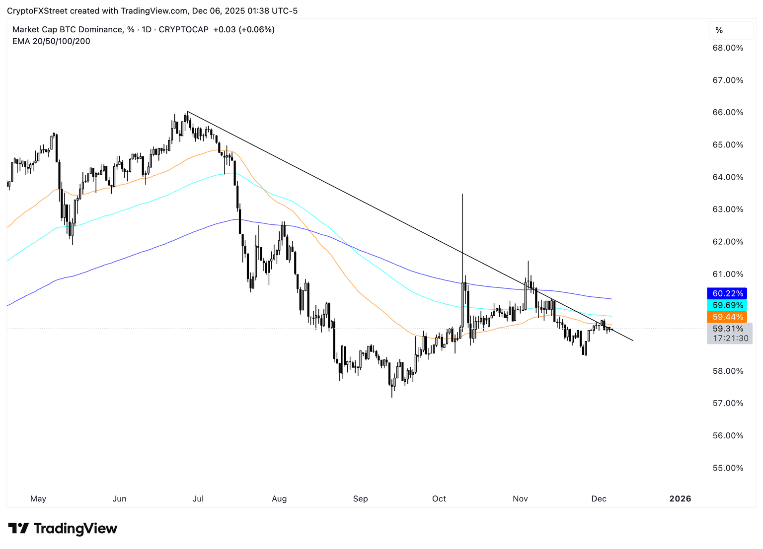 - Bitcoin dominance drops under 60%, year-end rally may be delayed.