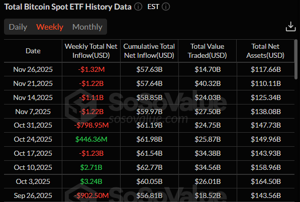 Institutional demand for Bitcoin shows a reduction in selling pressure compared to previous weeks. According to SoSoValue data, US-listed spot Bitcoin ETFs recorded a total outflow of $1.32 million until Wednesday in a shortened week due to the Thanksgiving day on Thursday, after a massive streak of outflows since the end of October. For BTC to continue its recovery, the ETF flows should turn positive and intensify.