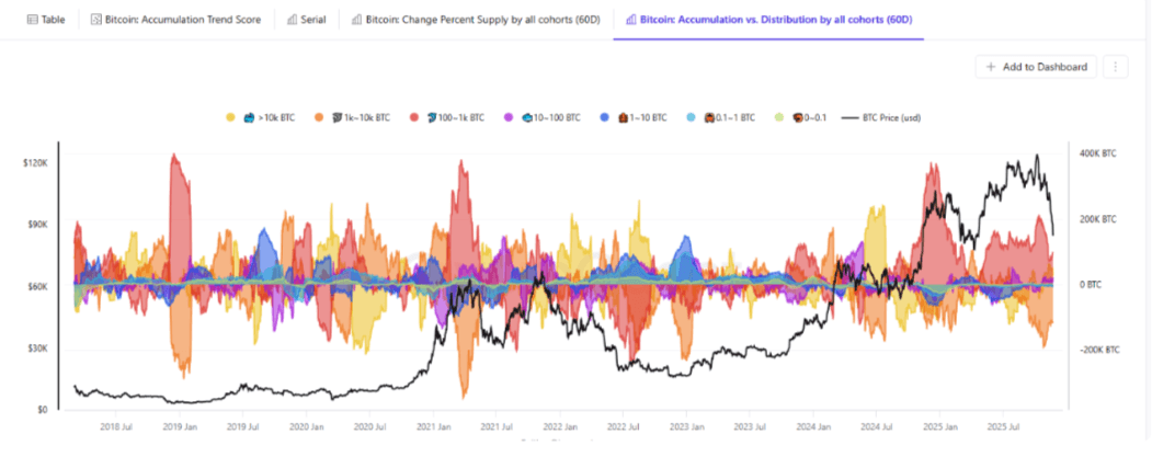 These large whales have continued to distribute, alongside retail investors (with 0–1 BTC and 1–10 BTC). Overall, BTC could have formed a potential local bottom, supported by a strong rebound and accumulation from the mid-sized wallets. However, persistent selling from the crucial 1,000–10,000 BTC group continues to limit confirmation of a broader trend reversal. The current price recovery is encouraging, but a decisive shift in whale behavior is still required to signal the end of the bearish phase.