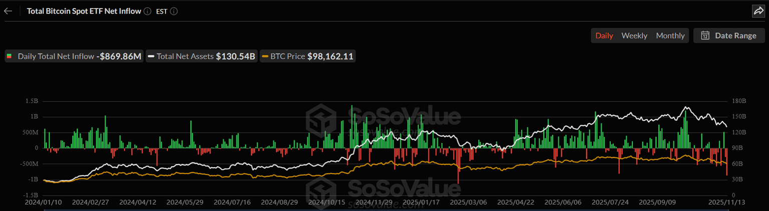 Institutional pressure intensified the selloff, with Bitcoin spot ETFs posting $622.70 million in net outflows so far this week, marking a third consecutive week of withdrawals since the end of October. Moreover, on Thursday, it recorded an outflow of $869.86 million, the highest single-day negative flow since February 25. If this trend persists and intensifies, Bitcoin could face a deeper price correction, reflecting waning institutional confidence.
