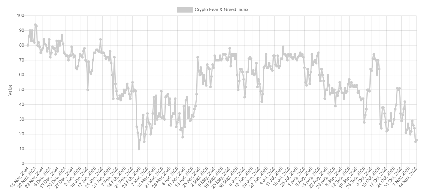 The Fear and Greed Index falls to 16 on Friday, nearing early March lows, indicating a sharp shift toward extreme fear as market participants brace for further downside.