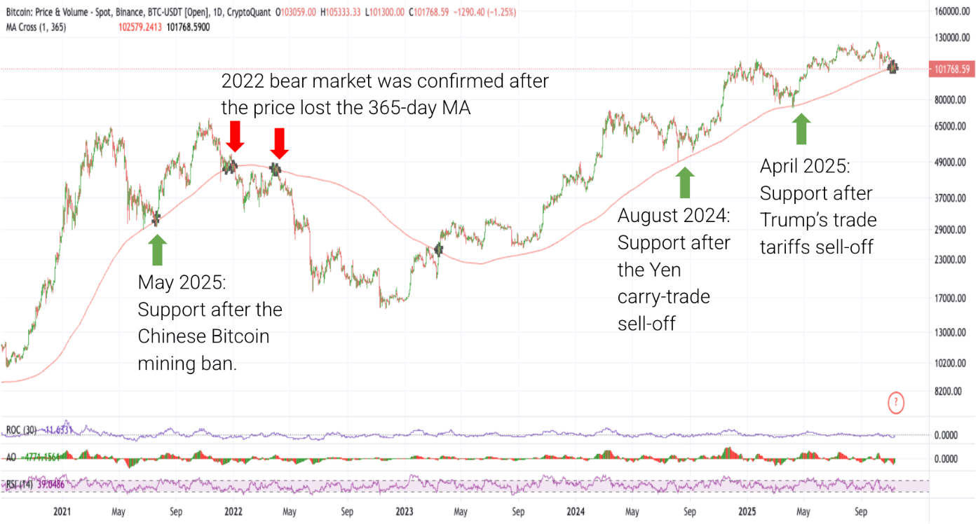 The report concluded that the 365-day Moving Average (MA) around $102,000 is the key technical and psychological support level to watch, as it has acted as the support level so far this bull cycle (green arrows in the chart below), and was one of the last signals triggered as the bear market began in December 2021-January 2022. Failure to reclaim the 365-day MA may accelerate a deeper correction. Notably, Bitcoin has closed below the 365-day MA on several occasions during the current period, a phenomenon that has not occurred previously in this bull market. If enough selling pressure emerges, the next price supports would be the 2x Metcalfe Network Value band at $91,000 and the Traders’ minimum price band at $72,000.
