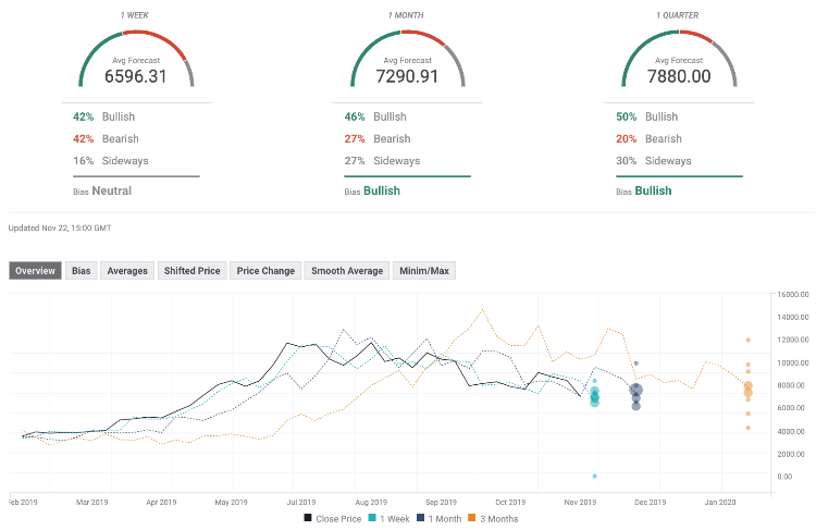 The Forecast Poll of experts worsened since the previous week. While expectations on all timeframes are bullish, the average price forecasts are below 8,000. The overview chart shows lowering average targets all over the three timeframes polled, though. The 1-quarter average forecast is down almost 1000 pips, from 8870 last week to 7880 this one, clearly showing the influx of pessimism that the week brought the Bitcoin market.