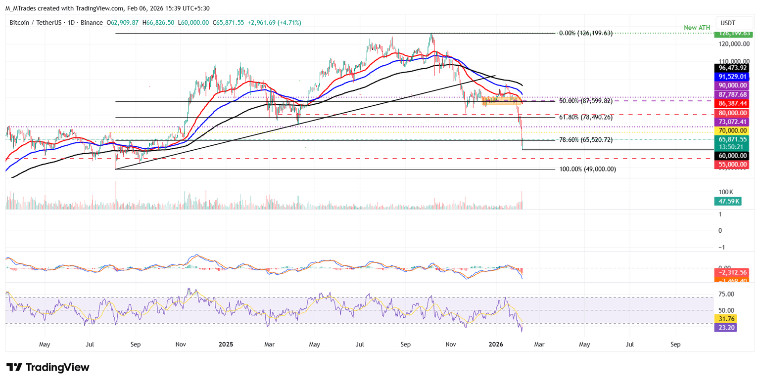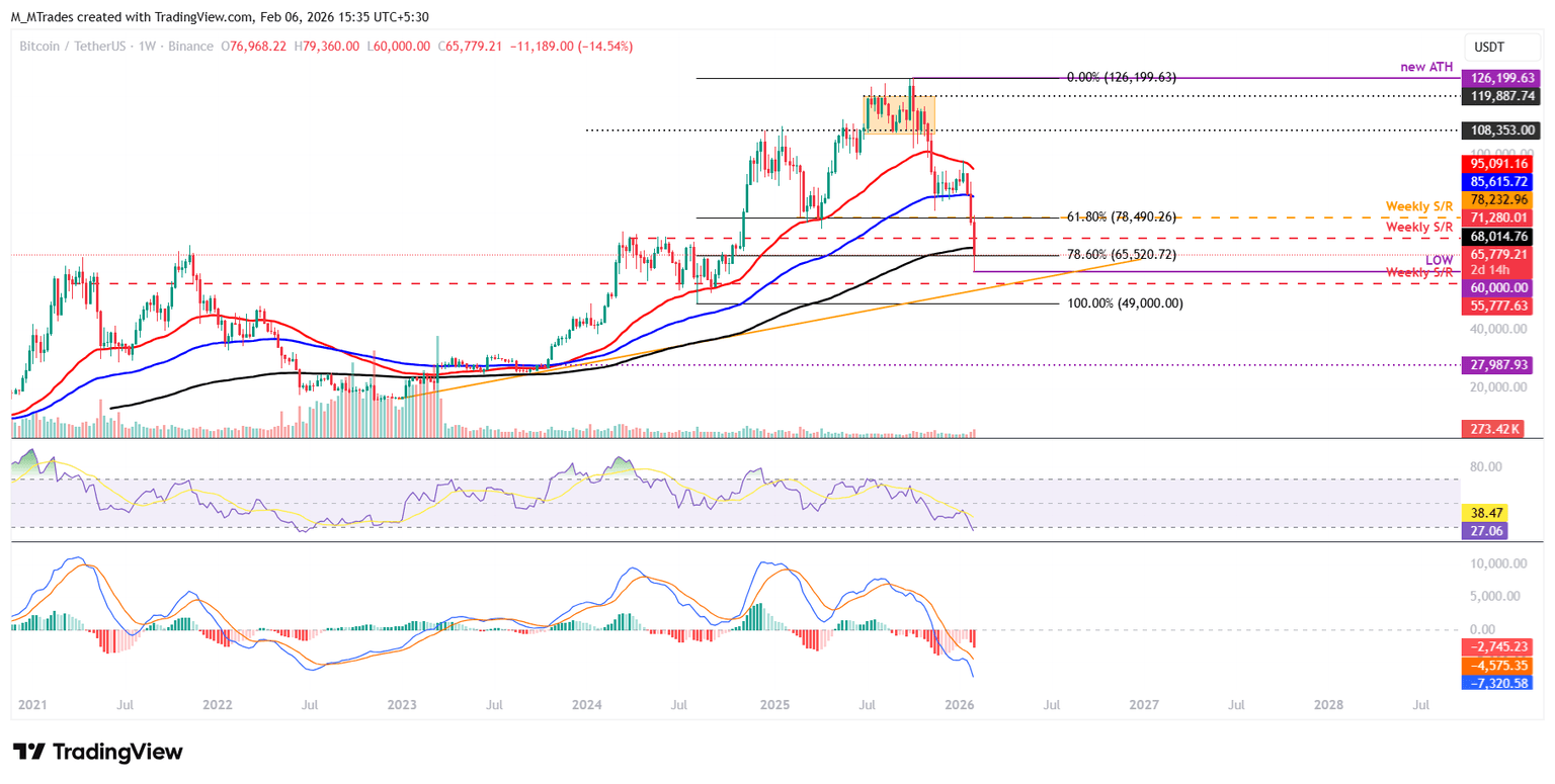 If BTC closes below the 78.6% Fibonacci retracement level (drawn from the August 2024 low of $49,000 to the October 2025 all-time high of $126,199) at $65,520 on a weekly basis, it could extend the decline toward the next weekly support at $55,777, which roughly coincides with the ascending trendline (drawn by joining multiple lows since December 2022).