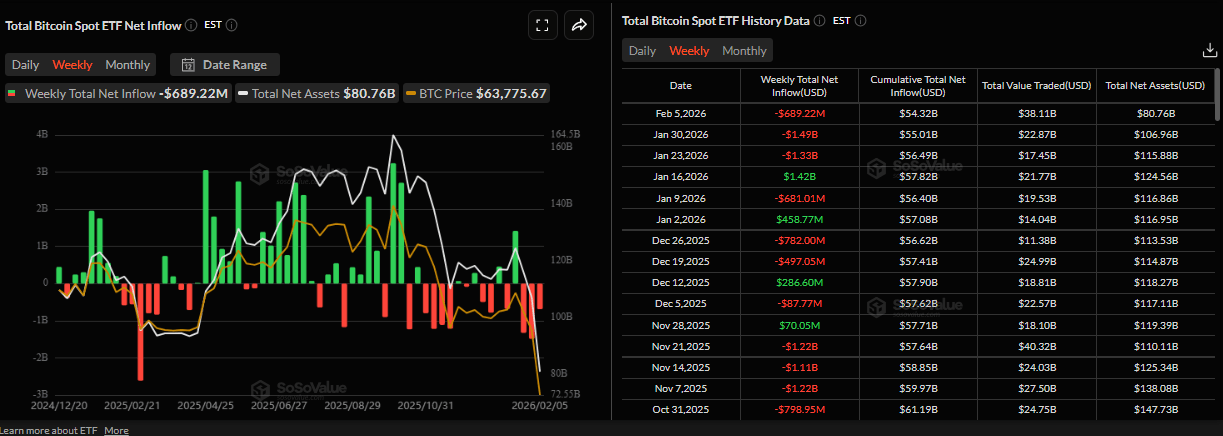Bitcoin (BTC) price recovers slightly, trading at $65,000 at the time of writing on Friday, after reaching a low of $60,000 during the early Asian trading session. The Crypto King remained under pressure so far this week, posting three consecutive weeks of losses exceeding 30%. Institutional demand for BTC continues to weaken, pointing to a third consecutive week of withdrawals.