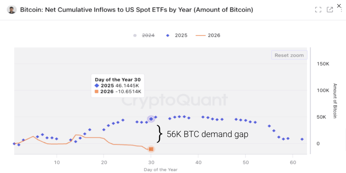 A deeper dive into institutional demand reveals that demand for BTC has reversed materially. The CryptoQuant chart below shows that, compared with the same period last year, these ETFs purchased 46,000 BTC on a net basis, contributing to Bitcoin demand growth. However, ETFs have been net sellers of Bitcoin so far in 2026, reducing their holdings by 10,600 BTC, leaving a 56,000 BTC gap versus last year. This has led to lower demand and greater selling pressure.