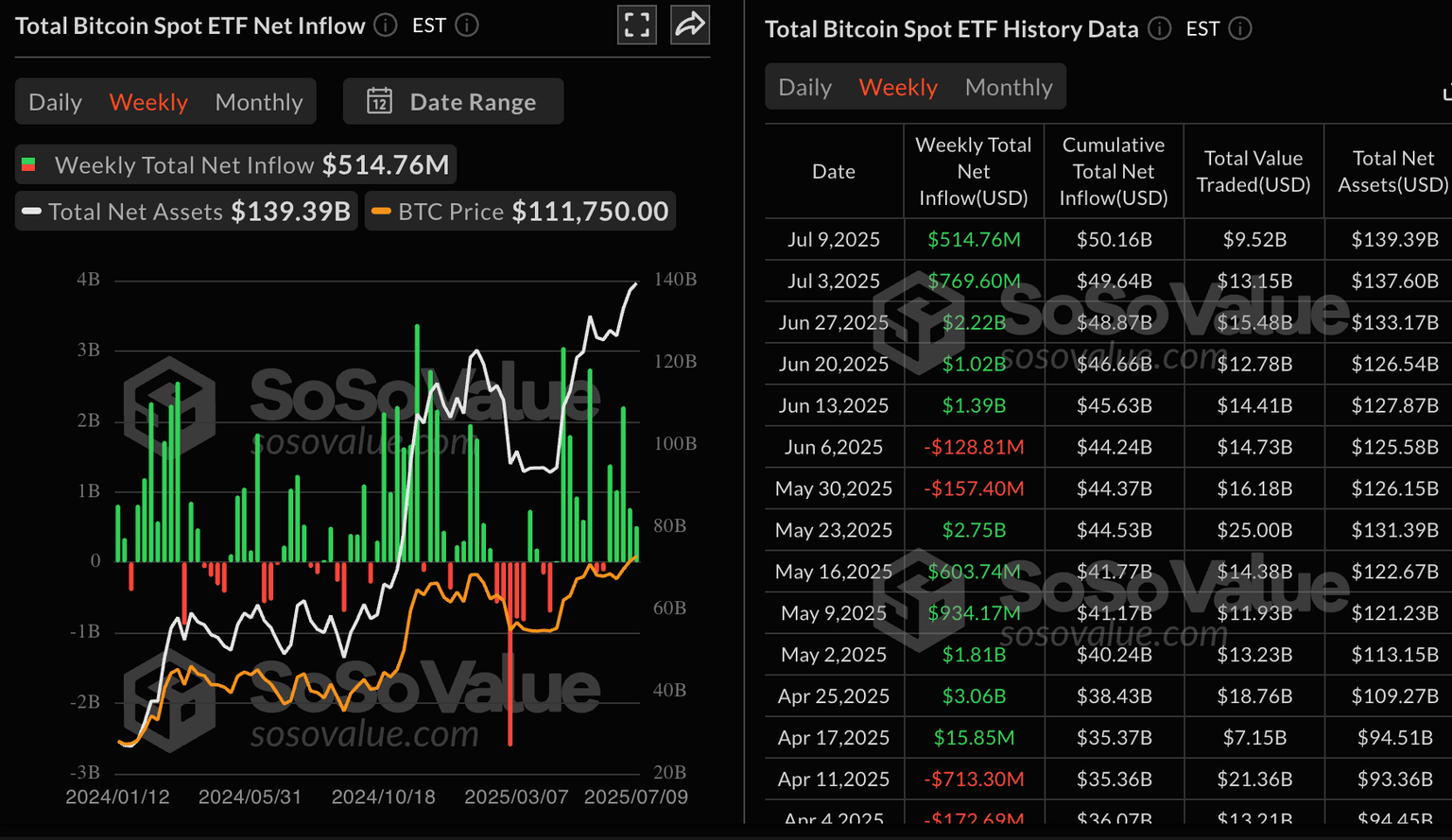 The uptrend is on track, with approximately $515 million coming in this week, as seen in the chart below. Meanwhile, the cumulative total net inflow volume has crossed the $50 billion mark, with net assets averaging $139.4 billion.