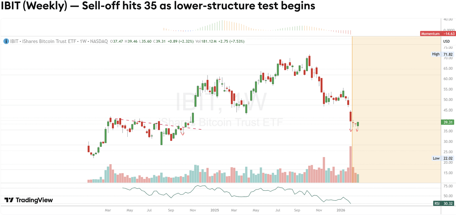 The next test is acceptance, not a tag. IBIT can bounce into 38.38/40.10, but the tape only improves if it can hold above that band and start printing stronger weekly closes. Until 47.00 is reclaimed, rallies can still behave like repair rather than a full recovery.