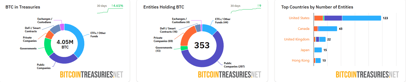 According to data from BitcoinTreasuries.net, more than 353 entities collectively hold around 4.05 million BTC, representing roughly 20.31% of Bitcoin’s current circulating supply of 19.94 million and 19.3% of its total supply of 21 million BTC.