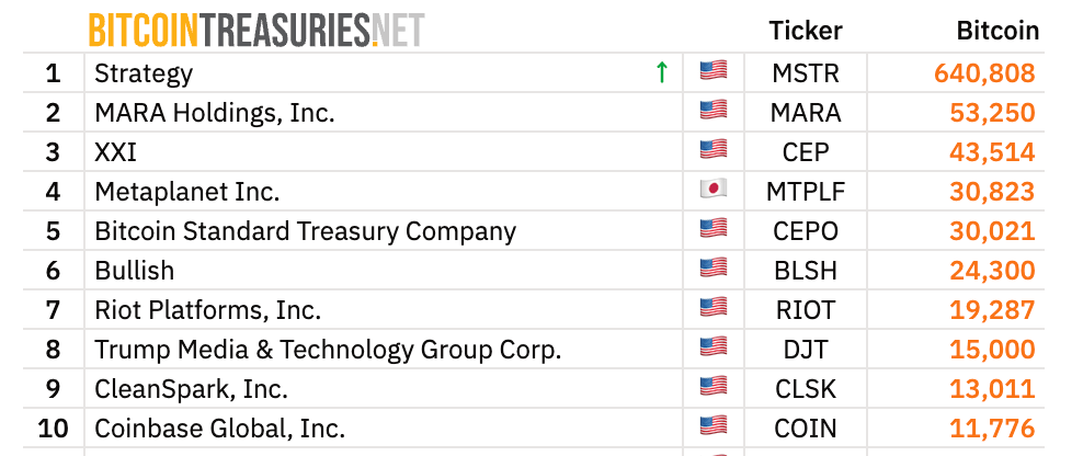 Digital Asset Treasuries are accumulating Bitcoin, as the Nasdaq-listed Strategy (MSTR) led by Michael Saylor holds 640,808 BTC worth $69.06 billion, as of October 30. At the same time, Marathon Holdings holds 53,250 BTC, worth approximately $5.73 billion, while Metaplanet has acquired 30,823 BTC, valued at $ 3.34 billion.