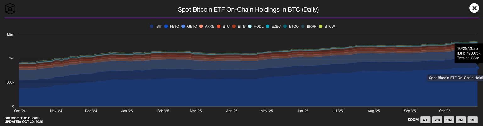 After years of legal struggle and BlackRock’s initiative, 12 Bitcoin-linked spot Exchange Traded Funds (ETFs) were listed in January 2024. This provided an institutional flow into Bitcoin, which, as of October 30, holds 1.35 million BTC or nearly 6.5% of the total Bitcoin supply.