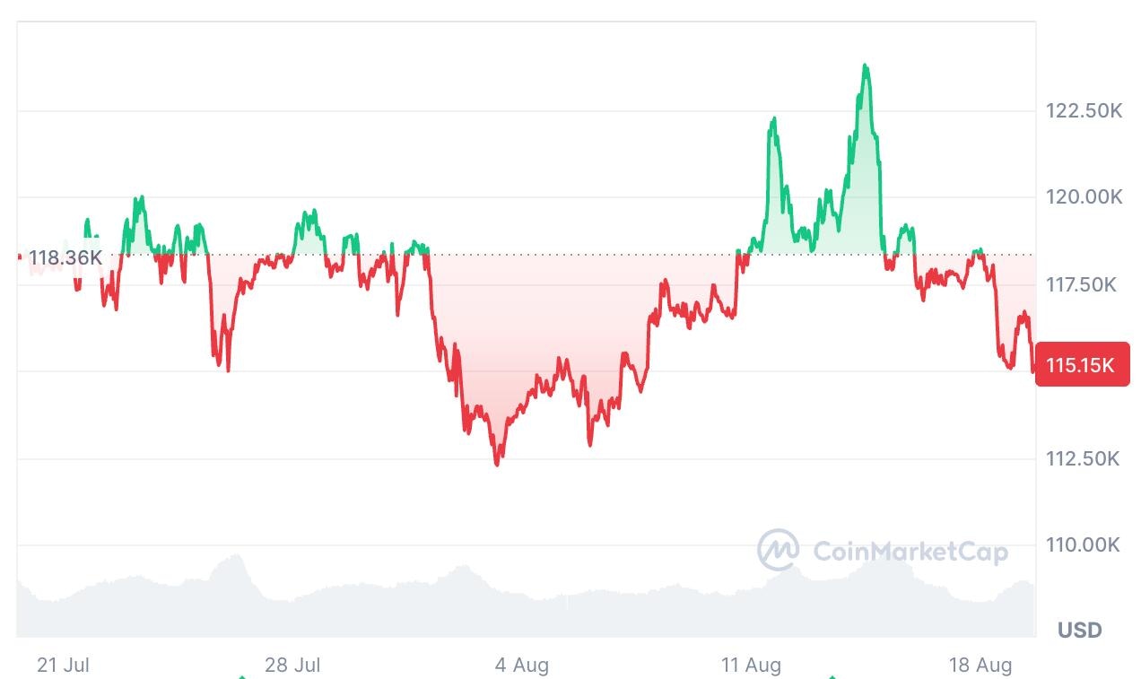 After climbing to a new all-time high of $124,128 on Wednesday, Bitcoin has pulled back 6% to about $115,150. Source: CoinMarketCap.