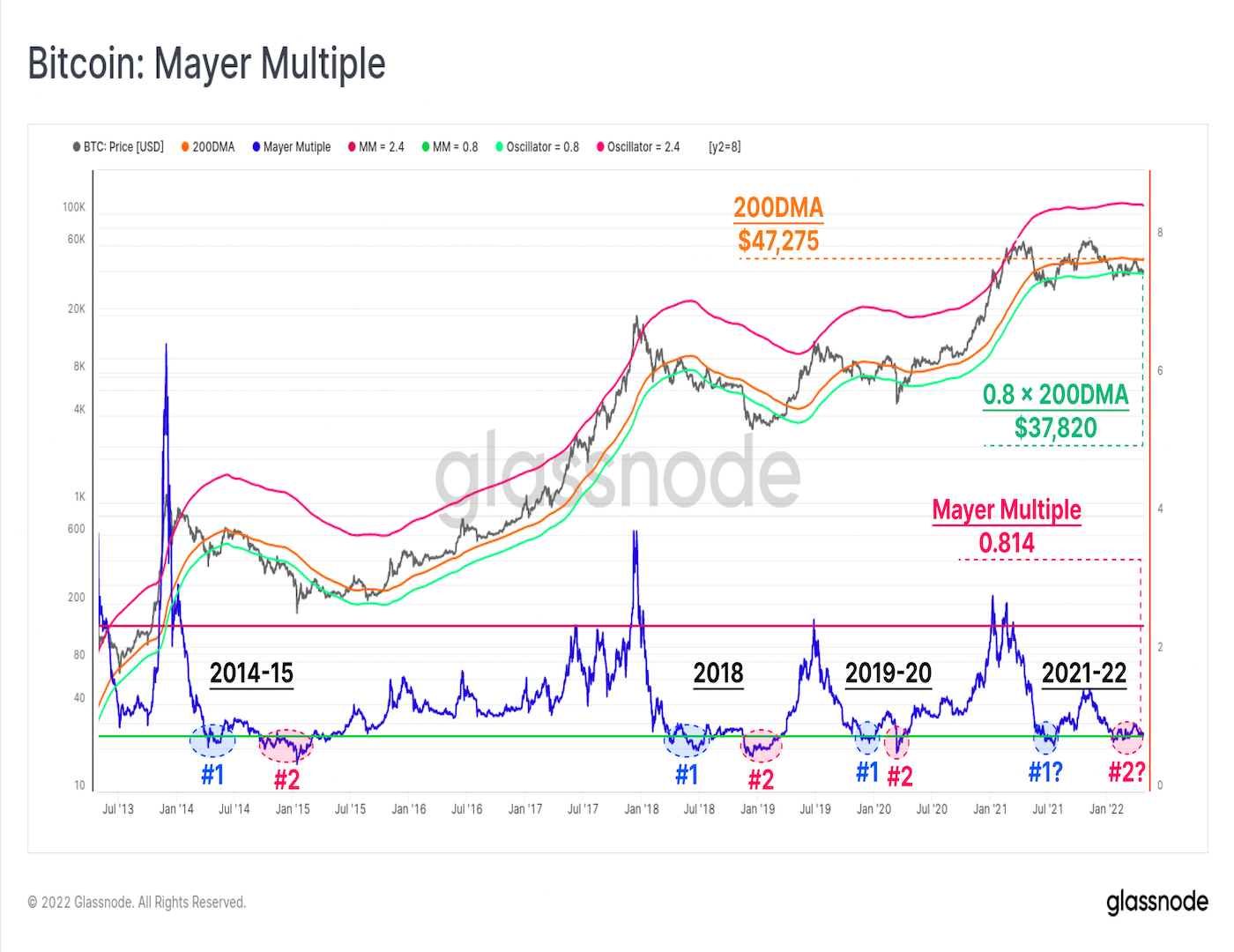 "We have mapped out a Mayer Multiple of 0.8 (green trace) as a historical 'undervaluation' level. The basis for this is that less than ~15% of bitcoins trading life has been at, or below this level, providing a more probabilistic view," Glassnode's analyst James Check wrote in a weekly analytics newsletter published on Monday.