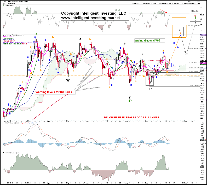 “Ending Diagonals are tricky because all their waves (i-ii-iii-iv-v) comprise three waves: 3-3-3-3-3 = abc-abc-abc-abc-abc. Thus, like the grey W-i and W-ii, we expect the grey W-iii to form three (orange) waves, as shown in Figure 1 below. Ideally, we see a bit more upside to around $65+/-1K, followed by a modest pullback (orange W-b) to around $61+/-1K before orange W-c to $73-79K kicks in. Contingent on holding above the warning levels...”